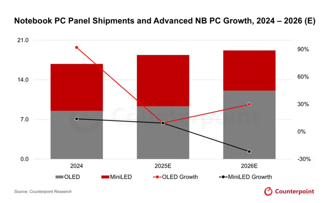 市場調査会社CounterPoint Researchが発表した最新分析レポートによると、企業の設備更新需要、人工知能(AI)応用の拡大、新製品の継続的な投入といった複数の要因が重なり、世界のノートパソコン用ディスプレイ市場は今後も堅調な成長を続ける見通しだ。特にOLEDノートPC用パネルは2026年に前年比30%の成長を達成する見込みで、強い拡大ポテンシャルを示している。